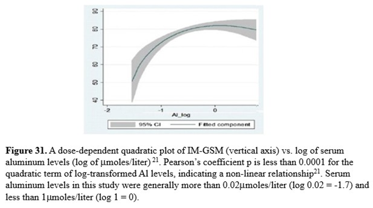 The subject’s blood serum was analyzed for 11 metals including: aluminum, cadmium, cobalt, chromium, copper, mercury, manganese, molybdenum, nickel, lead, and zinc. Only aluminum was found to significantly (p = 0.0001) increase IM-GSM in a non-linear dose-dependent manner as shown in figure 31 plotted as log-transformed aluminum levels versus IM-GSM21.