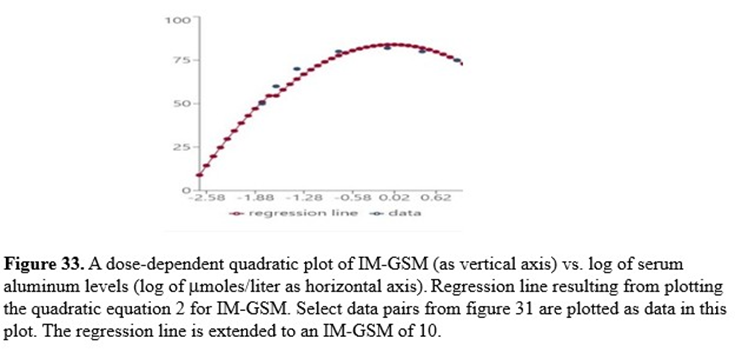 Quadratic regression analysis of data pairs of IM-GSMs and logarithms of the chronic level of aluminum (mmoles/liter) in the blood ([Al]Blood) reveals that IM-GSM can be calculated by the following fitted quadratic equation. This equation fits the data with a coefficient of determination (R2) of 0.94333 very close to 1.0 representing a good fit with the data: